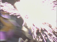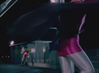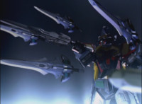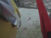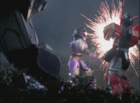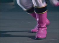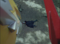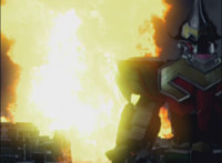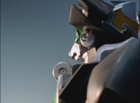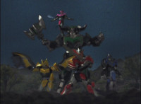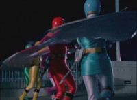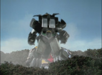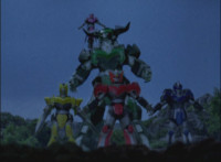 Cuts shot 2 before Megazord turns around; cuts follow-ups of Yellow & Pink gesturing in cockpit, then Megazord posing in the sunlight. |