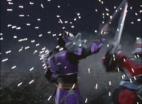 Flytrap stands across the city, ready for Titan Megazord, extending vines at it, only for the Titan Megazord to conjur up multiple floating sabers that it gestures forth and sends flying at the vines, bursting them to bits, also hitting the monster repeatedly. |