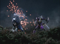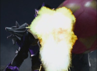 Flytrap gets energy slashed, crackles and writhes. Titan Megazord slides fingers across its cap brim, Flytrap crackles even more, Titan Megazord retracts its wings, and the monster explodes brightly behind it. |