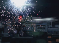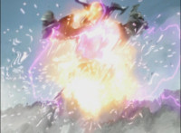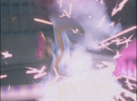 Koragg erupts with a superimposed explosion when struck by the Soccer Sprite, sliding back, but recovering as he faces Mystic Garuda & Mystic Sprite, floating before him. He talks, they respond battle ready, so he gestures to the side, and from a purple seal out pops Catastros. Koragg floats into the air. |