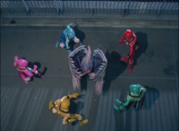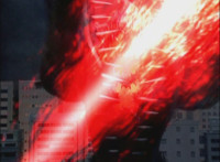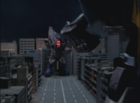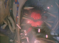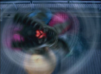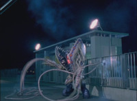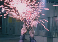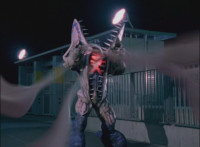 Cuts follow-up additional downward shot of the Rangers spinning around monster. |