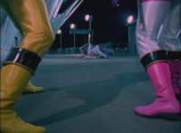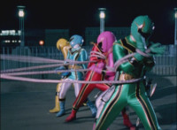 Yellow fires his crossbow forth, spark bursting Flytrap. Pink motions forth, then leads the team in leaping over, landing in a circle around Flytrap, where they each spin around in place, twirling their capes. |