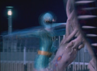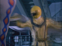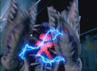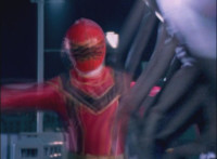 Caught up in a whirlwind, Flytrap is lifted off his feet, into the air by the twirling Ranger dervish, ejecting him back down onto the cement harshly. The Rangers pose at him, as Flytrap recovers, then crackles with energy, growing giantically. |