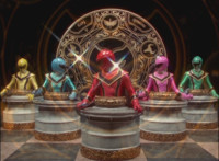 Zoom out from Red in the cockpit as he leads the team in gesturing in unison, then touching the chesspiece seat's control rim, causing it to glow yellow. Titan Megazord creates a colorful energy seal with its Titan Saber, then unfurls its wings, and poses. |