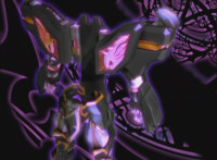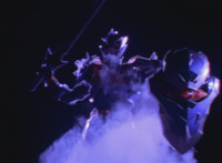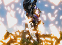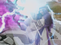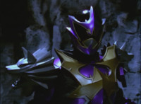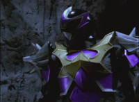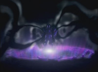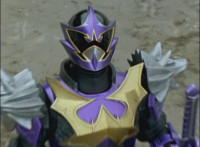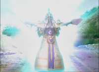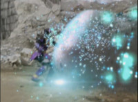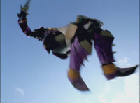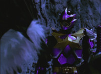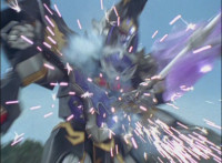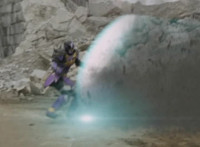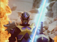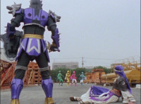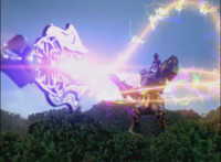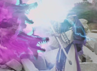 Centaurus Wolf Megazord charges up their saber with dark energy, before energy slashing forth. Gatekeeper is struck by the slash, causing her to explode massively, then disintegrate, before rematerializing small, then collapsing backwards. |