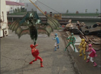 Necrolai takes flight, leaving the five Rangers behind, watching from below. |