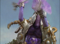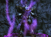 Morticon stabs the tip of his sword into the cement, before resting the sword over his shoulder and talking as he walks forth from his throne. |