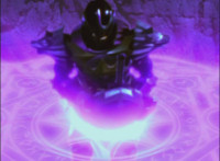 Koragg's shield opens up and the gem gleams red, as he charges up with black energy tendrils above a purple seal. |