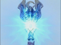 Clare's Gatekeeper staff is lifted up, gem gleams, then is turned sideways. |