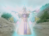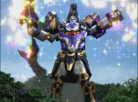 Centaurus Wolf Megazord's eyes flash, as they charge up using purple vapors from the seal they're standing on. |