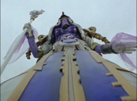 Centaurus Wolf Megazord shatters the golden energy disc into pieces, zoom in on Gatekeeper reacting. |
