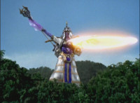 Centaurus Wolf Megazord gets ready and fires an energy bolt forth as Gatekeeper zaps her staff at him, the combined energies exploding massively between the giants. As the flames clear, Gatekeeper slashes downward. |