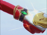 Gatekeeper twirls her staff, creating a golden moon, which she turns into a gold energy disc that she flings forth. Centaurus Wolf Megazord's eyes glow, chest gem gleams, then they break out of the energy binds, before blocking the energy disc with their saber, causing them to slide back. |