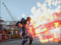 Red races forth, slashing purple energy bolts away, before ducking, rolling, and rising up with a kick. |