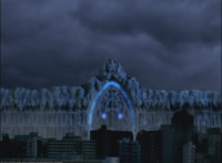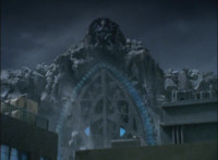 Distant shot of the gates to the Underworld rising up in downtown Briarwood city. |