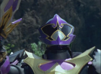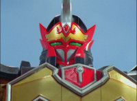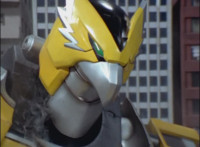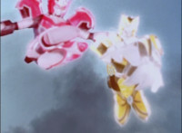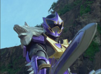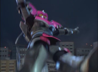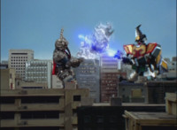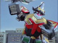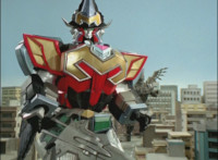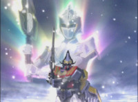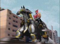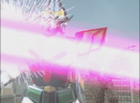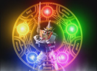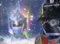 In an energy tunnel full, Mystic Phoenix transforms along with Catastros, creating the Centaurus Phoenix Megazord. Centaurus Phoenix Megazord whips its saber about and poses in the city. |