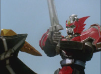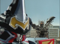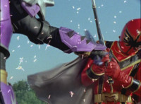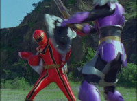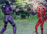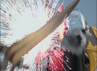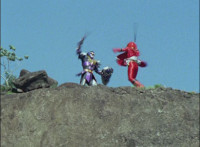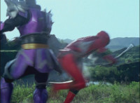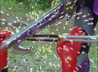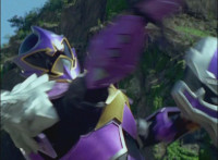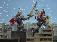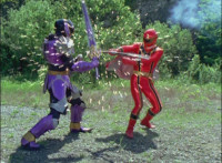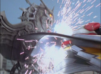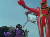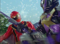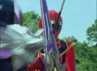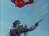 Cuts follow-ups of Megazord clashing saber with monster's forked staff, getting it caught in until they break free. |