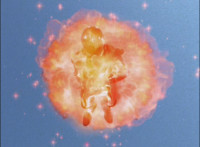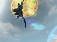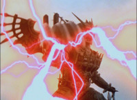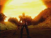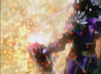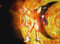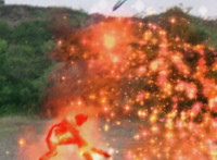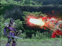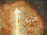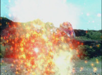 Red rolls, gets up, Koragg charges at him, and they resume their battle, on the side of the cliff. Koragg gets plenty of sparkily slashes in, before finally sending Red over the side of the cliff, flipping over as he spark bursts, and lands in the shallow pond below. Red quickly recovers, Koragg races at him. Red stands ready, gestures, then leaps up, ignites into a flaming energy bird, swoops down, and slices past Koragg, blowing him up. Red lands as normal, and watches Koragg spark burst as an explosion erupts around him. |