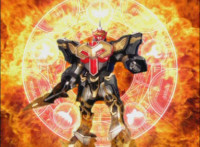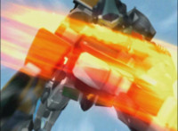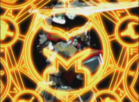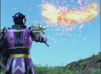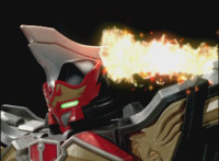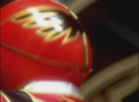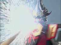 Centaurus Phoenix Megazord ignites its helmet-tail with flame-like energy, then whips its flaming helmet-tail around widely. |