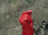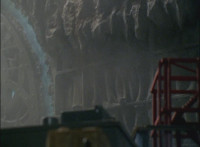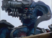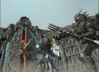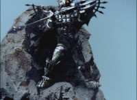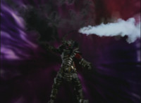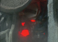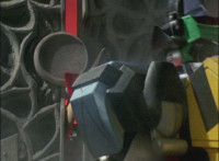 Morticon peeks out some more from the barely pried apart gates, each Ranger gets something quick to say, then the Titan Megazord notices Gargoyle is approaching. Morticon keeps trying to squeeze through the opening in the gates, talking as he does, Gargoyle creeps closer to the Megazord, Morticon talks more. |