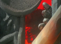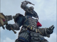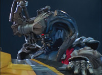 In a quarry at sunset, Koragg approaches Morticon's sword, sticking in the ground. He grabs it and claims it as his own, as the shot pushes in on his shield, which he uses to charge up the sword. |