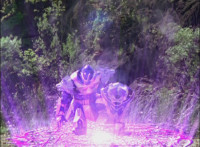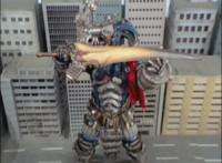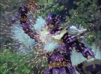 Titan Megazord energy slashes at Gargoyle, who teleports behind them, then sparkily slashes them, before teleporting away again when they go to slash at him. From this new position, Gargoyle is able to jab his fork forth, sparkily knocking Titan Megazord back. |