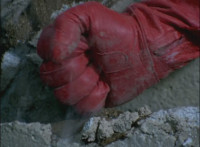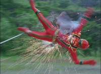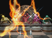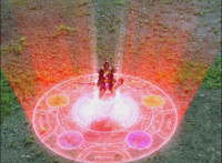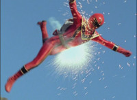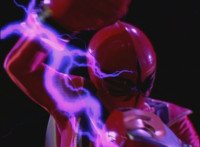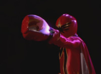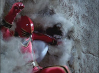 Morticon sparkily slashes each of the Mystic Titans down. Red clenches his fist, grabs Koragg's sword's blade, holds it up, then releases. Koragg goes to stab him, when Red motions and ignites, his spontaneous combustion freeing him from the Wolf Knight's grasp. Red flies straight up, then back down, flinging forth an energy seal that locks Koragg in place. He struggles, as the fiery Red falls down, throwing a karate chop that Koragg blocks with his sword explosively, Red landing with a shockwave that sends Koragg flying off, and breaks his sword in half. Koragg staggers back, spark bursts. Red snaps his fingers in the air, Koragg collapses, and explodes massively. Red quickly races to our right. |