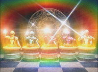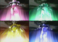 Four-screen shot of each Ranger turning into their Mystic Titan form, which then splits into a shot of the Mystic Dragon form. |