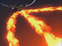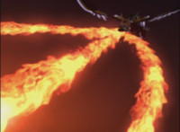 Mystic Dragon spews three streams of flames down at the Gargoyle of the Gates, wrapping around him, then causing him to explode massively. |