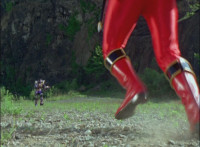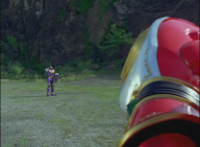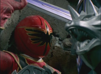 No longer armed with Mystic Fighters, Red falls and rolls, but quickly recovers, pulling out his Magi Staff, and charging at Koragg. He sparkily slashes at him, the Wolf Knight blocks, then strikes back, knocking Red down, before slashing at him downward, but the Ranger blocks, then kicks up at him, dodges out of the way as Koragg slashes some more at him. They lock weapons, then breaks off, with Koragg sparkily slashing Red repeatedly. |