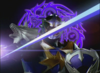 Mystic Phoenix, riding Catastros, gestures his sword skyward. |