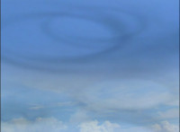 A hand holds a Mystic Morpher into the air, which creates a seal in the stormy sky above. |