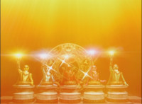 Below a yellow energy seal, the five Mystic Titans come together to form Titan Megazord. |