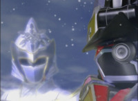The Rangers gesture their glowing Magi Staffs forth, Titan Megazord slashes through a colorless seal, clashing saber to sword, the energy impact causing Morticon's black flames to freeze into a solid block of ice, making him stagger back as the Megazord looks stunned. Each Ranger reacts, as the giant energt spirit of the White Mystic Ranger touches the saber-hand of the Titan Megazord, the Rangers reacting again, as they see her standing beside them, turning to them and talking, they respond. |