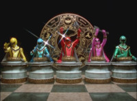 Red touches the chesspiece seat's control rim, causing it to glow yellow. Titan Megazord creates a colorful energy seal with its Titan Saber. Titan Megazord slashes through the yellow energy seal. |