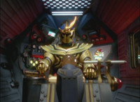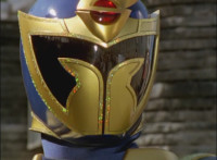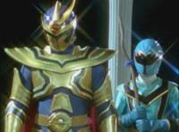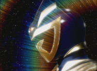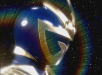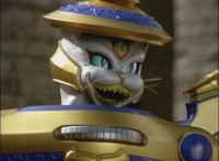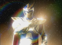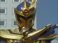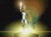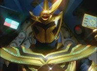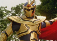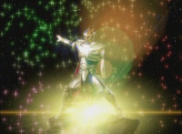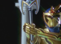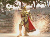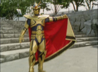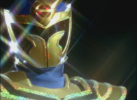 In a golden light, Daggeron's Mystic Warrior form gains armor, section by section. |