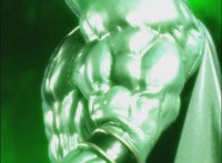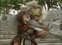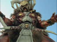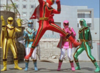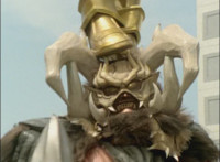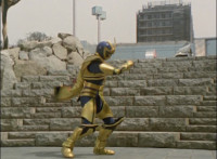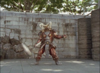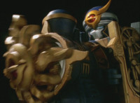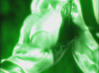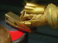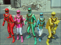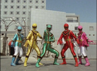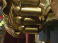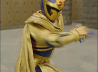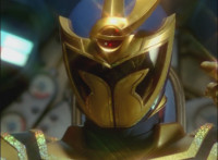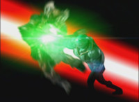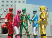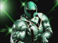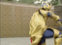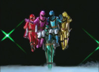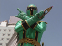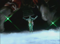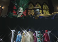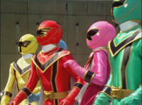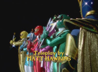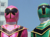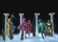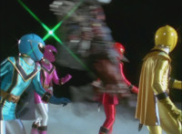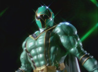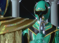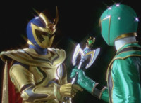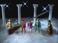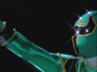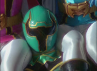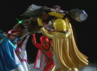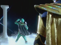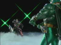Green steps up, motions his Mystic Morpher about, then presses the button on it, activating Mystic Muscles, causing him to Hulk out, then posing like a bodybuilder with his new physique. Now in another dimension, Behemoth points at him and swings his hammer. Green flexes, as his teammates join him. So he picks all four up at once onto his shoulders, speaks, Behemoth reacts, then Green hurls the Rangers forth, each one sparkily striking the monster on the way by. The four then pick up Behemoth, Green flexes, then they throw the monster at him, with Green awaiting his approach. |