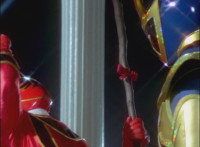 Red pulls out his Magi Staff, as he and his teammates look up at their brooms flying around above them. The five Rangers hold their Magi Staffs up and activate them, shooting bolts of colored energy up, claiming each broom for a Ranger. Solaris Knight snaps his fingers, and four of the brooms lower down beside a Ranger each. Solaris Knight goes to each Ranger and checks on their broom, except for Green, who has gone over and is firing bolts up at his broom, unable to catch it. The Rangers & Solaris Knight watch, disappointed. Green stresses over this, so Solaris Knight comes over, offers to take his Magi Staff, and uses it to tame the broom himself. The Rangers react to the broom, Solaris Knight speaks and returns the Magi Staff to Green. |