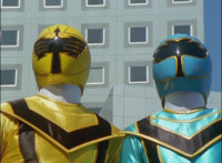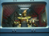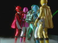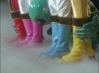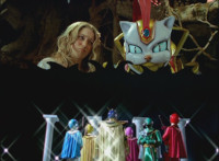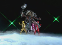 The five Rangers and Solaris Knight are tiny inside the mist-filled box below Clare & Jenji, then turn into balls of light and float up. |