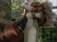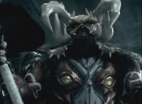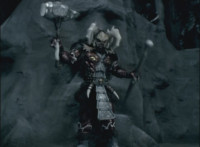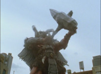 Close on Behemoth, jerking hammer and spike up and down at is sides as he speaks. |