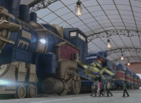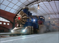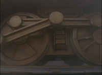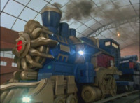 Jenji shovels coal into Solar Streak's furnace. He then talks to Solaris Knight, who responds, gesturing about the cockpit, where the various gauges are all active. Solaris Knight motions about, then pulls the levers, the train releasing steam. |