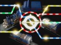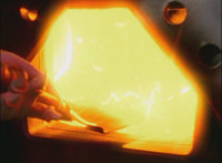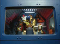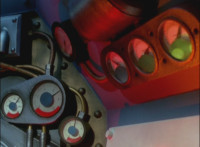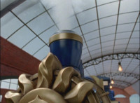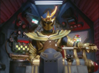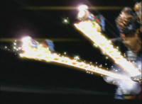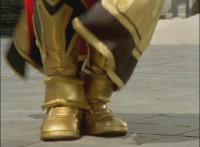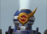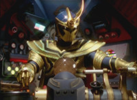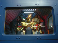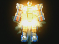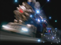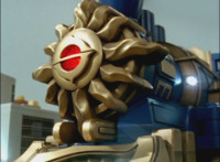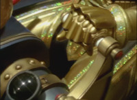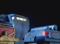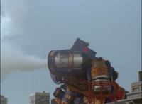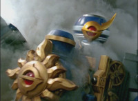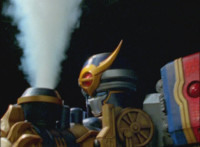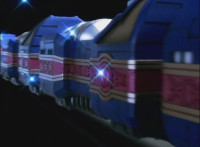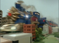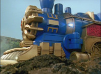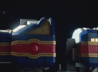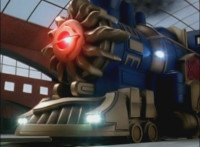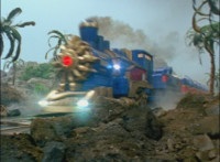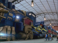Zoom in on Solaris Knight in his cab, as he pulls a lever. Solar Streak Megazord rears back, steam shooting out of its head, as it then bends over and shoots the steam forth, knocking Behemoth over. The Rangers cheer below. Behemoth recovers, so Solaris Knight pulls another lever. Solar Streak Megazord's boots open up and a pair of little trains shoot out and create golden energy tracks all around Behemoth, which solidify into binds around the monster. Solaris Knight speaks quick, then pulls another lever, causing the Solar Streak Megazord's chest symbol to open up, revealing an opening which fires a golden beam forth at Behemoth. He's struck, and absorbed by the light until he's converted into energy, then sucked into Solar Streak Megazord, which turns him into fuel for its furnace, before it closes up, followed by closing up its chest symbol. Solaris Knight snaps his fingers, then gestures his left hand. Solar Streak Megazord spews steam as it stands triumphant. |