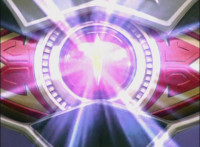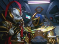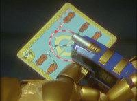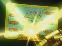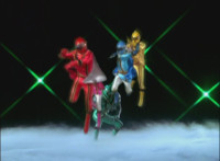 Solaris Knight hole punches a card with his Solar Cell Morpher, which he then holds up as the hole punched shimmers golden. Solar Streak transforms from train mode into four compartments, which then transform into the Solar Streak Megazord. The Rangers rush up and look upon it in awe. |