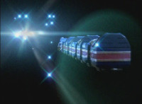 Solar Streak Train chugs along through the sparkly void, as the camera zooms in on the window of the passenger area. |