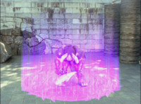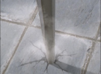 Close-up of cement as the spike dissolves into sparkles while the golden light fades away. |