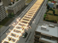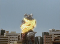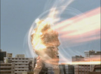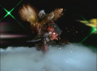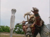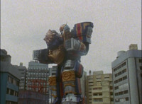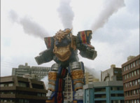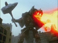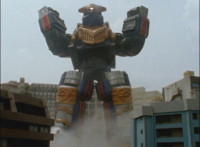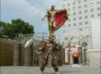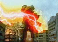 Solar Streak Megazord stands ready in the city, when Behemoth spews electricity forth, bursting around the new Megazord, engulfing it in smoke and sparks. Behemoth slaps his hammer to his palm proudly, when Solar Streak Megazord suddenly emerges from the smoke unscathed. |