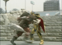 Cuts a pair of Ranger reactions between shots 8 & 9; cuts additional shot of Green holding up team between shots 10 & 11; cuts follow-ups of Green punching Behemoth in the head, causing him to spin in place as Green winds up his arm for another hit. |