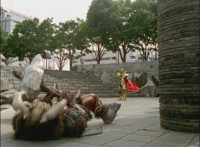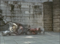 Cuts final shot before impact of hammer to head, and cuts follow-ups of Behemoth's head bursting. |