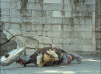 Cuts follow-ups of Behemoth seeing cape and angrily acting like a bull before racing forth. |