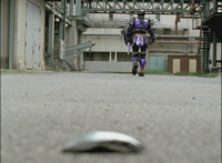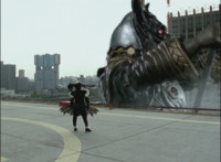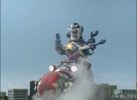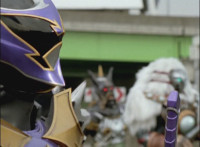 As Necrolai stands there, Fightoe leaps into the purple seal over the edge of the roof, and through it, grows gigantic. As he towers over the city, the five Rangers fly in on their Mystic Racers. |